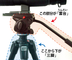 三脚は大きく、“雲台(うんだい)”と“”という、2つのパーツから構成されています。
